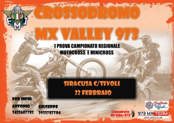 Il Motoclub 973 MX TEAM organizza la VI° prova del Campionato Regionale Motocross . La manifestazione si svolgerà Domenica 05 Novembre 2023 a partire dalle ore 08:00 presso il ” CROSSODROMO MX VALLEY 973″ di Contrada Tivoli (SR). Al termine delle gare si svolgeranno due manche come di consueto per ogni categoria. A seguire si svolgerà la cerimonia di Premiazione per i primi tre di ogni gruppo previsto ed 1 primi cinque delle classi del minicross .