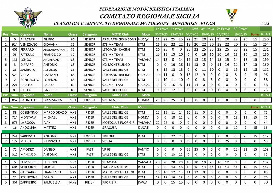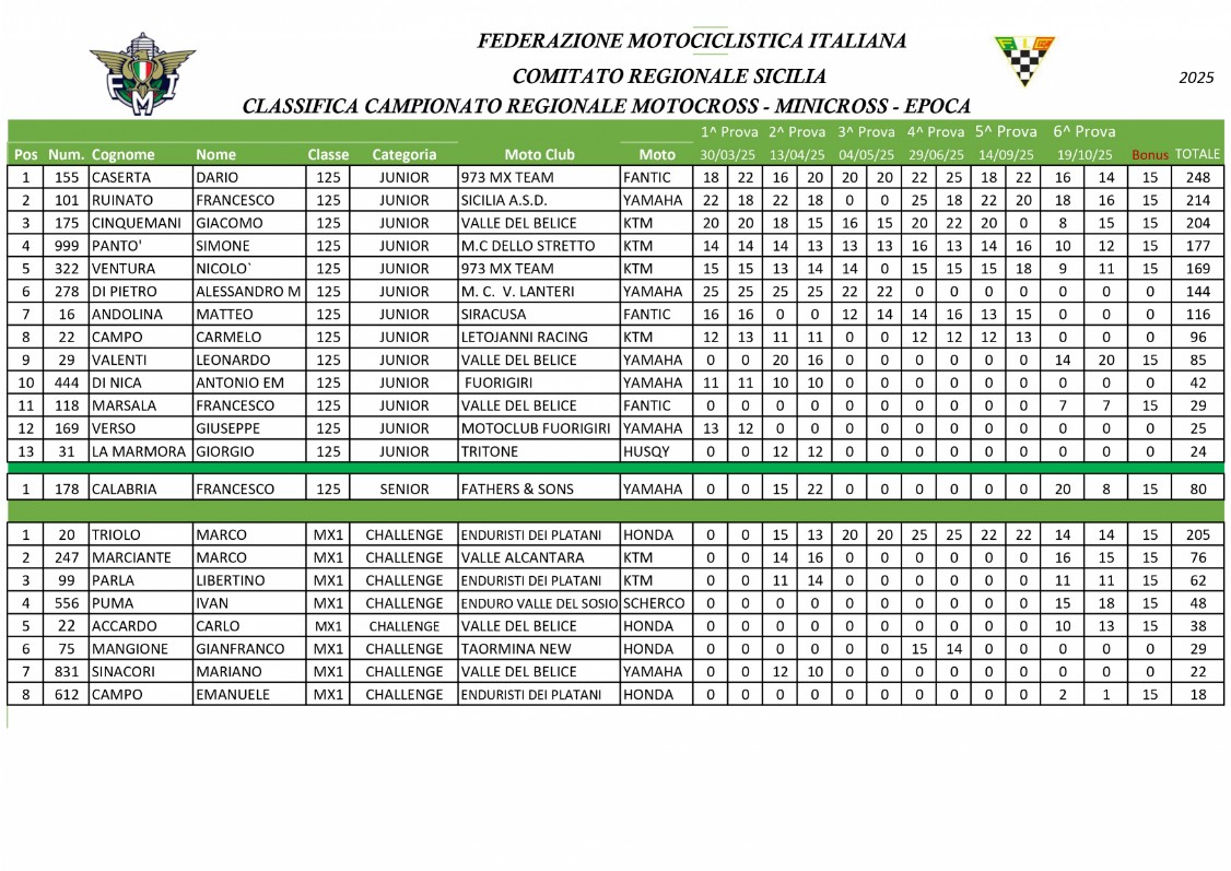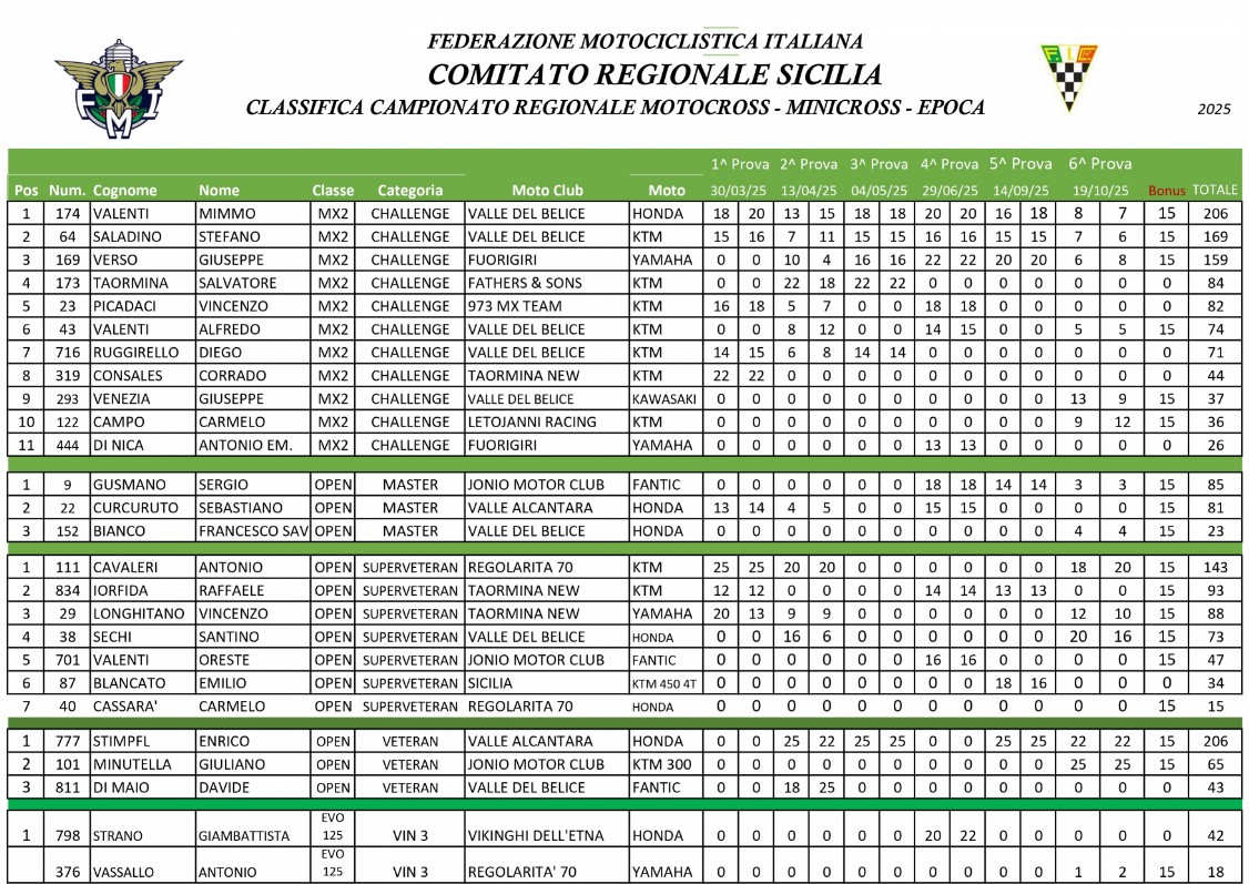 Classifica Finale Campionato Regionale Motocross Sicilia