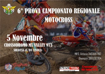 Il Motoclub 973 MX TEAM organizza la VI° prova del Campionato Regionale Motocross . La manifestazione si svolgerà Domenica 05 Novembre 2023 a partire dalle ore 08:00 presso il ” CROSSODROMO MX VALLEY 973″ di Contrada Tivoli (SR). Al termine delle gare si svolgeranno due manche come di consueto per ogni categoria. A seguire si svolgerà la cerimonia di Premiazione per i primi tre di ogni gruppo previsto ed 1 primi cinque delle classi del minicross .